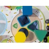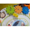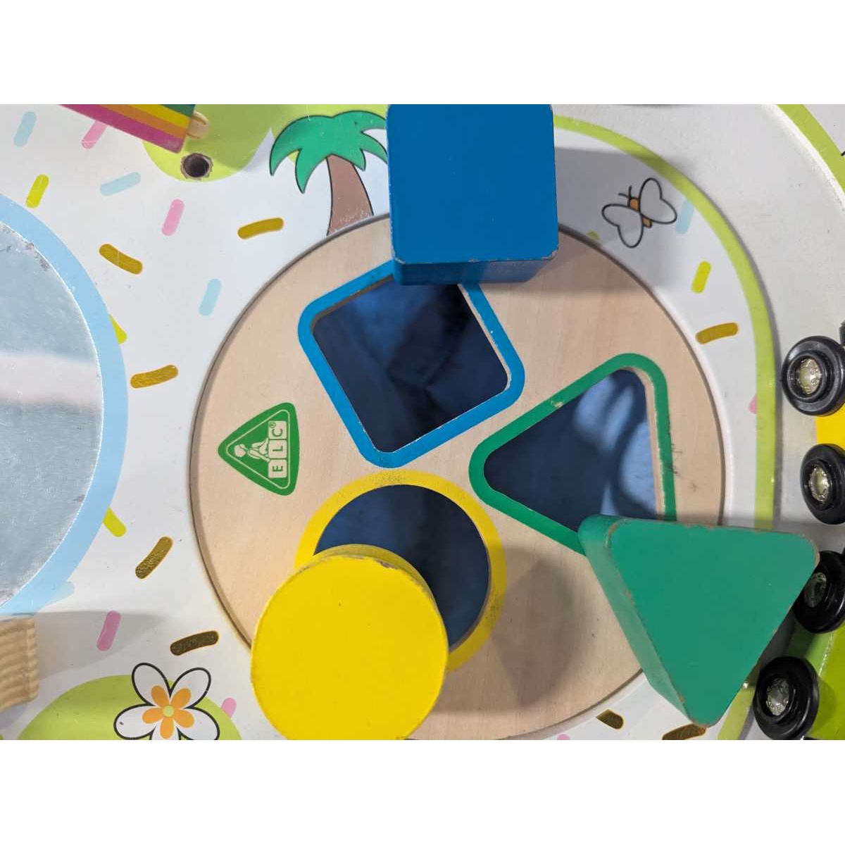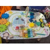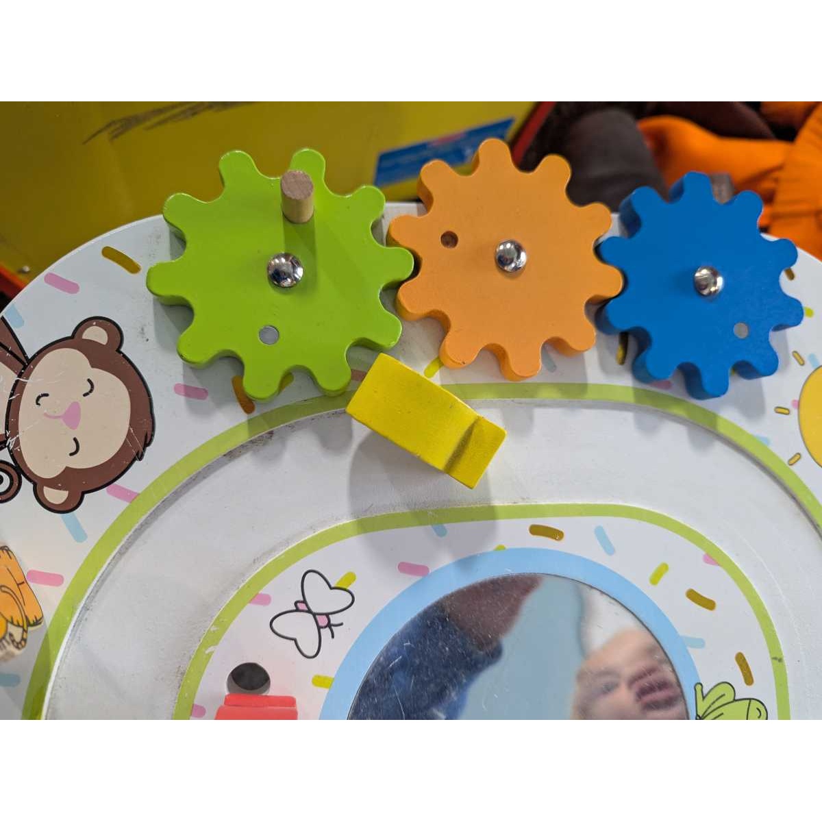 Wooden play table with mini trains, wooden animals, shape sorter, beads, cog wheels