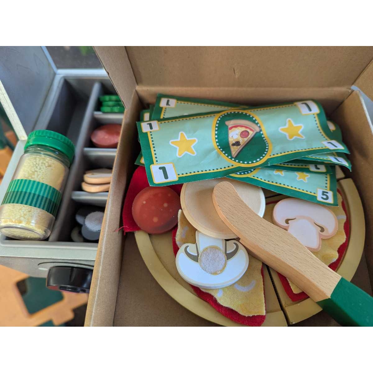 A PIZZA COUNTER SET: The Melissa & Doug Top and Bake Wooden Pizza Counter Play Food Set is a 34-piece wooden play pizza-making set with counter/pizza oven that allows kids to create made-the-way-you-like-it pretend pizza